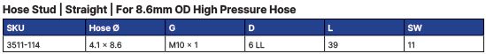 - 3510-101 | Hose Stud Straight – M10×1 × 6 mm LL Series for 8.6 mm OD hose (L = 39 mm)