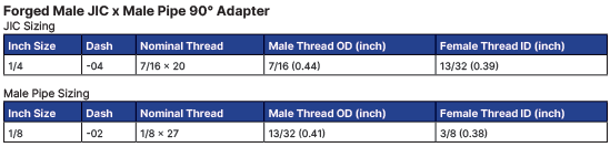 - 2501-04-02-FG | 90° Male JIC × Male Pipe Adapter – Transitions from JIC 37° male flare to 1/8 NPT male pipe thread at a right angle, simplifying hose routing in limited-space installations.